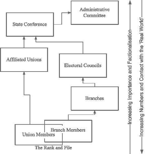 Factions are not formally part of the structure of the Labor Party, but their members compose a percentage of all party units, most especially the higher echelons. In a self-reinforcing pattern, factions are able to determine the outcome of most significant decisions, which means that they are able to command the loyalty of their members, and generally above and beyond loyalty to the rank and file. Because the main source of information about happenings higher up the structure is the delegates themselves, this conflict of interest is only rarely visible to those below. Because this dilution of democracy is repeated at every level of the structure, alignment between the rank and file and the Administrative Committee is effectively non-existent. Most of the Rank and File do not realise that they, indirectly, choose the Administrative Committee, or even that it exists.