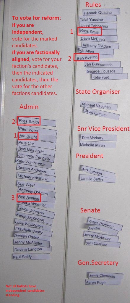 At previous state conferences, the weight of the unions’ block vote has effectively meant that no-one outside the group endorsed by the faction heavies has had a realistic chance of being elected to the Admin Committee. However, last year’s Federal intervention into the NSW Branch, and the resulting new structure and election arrangements for the Admin Committee, have now provided the rank & file membership with a window of opportunity to get some members of their choice elected.